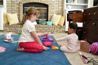 Stella, ever the patient big sister, was so good with Vivi and showed her how to find eggs and put them in her basket. At first the eggs seemed to scare our new family member, but once she figured it out she LOVED it. She adored finding them and putting them away in her basket. Once she figured out that there was candy inside she was pretty much in heaven. After all the eggs were found, Vivi loved playing with her new toys and playing with her new sister. Watching Stella get to be a big sister and do her Easter thing with another person brought so much joy to my heart. Our girl was finally home with us and enjoying her first taste of holiday fun.
