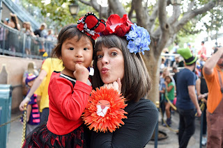 About a week before we left for California Heidi and I decided on a Alice In Wonderland theme for our group costume. I was fine just going in Halloween shirts but Heidi was certain it would be a missed opportunity if we didn't wear a group costume. It was so fun to see us all together when we first found each other in front of the entrance of the park. It was a lot of extra effort to get together these cute costumes and when I saw us all together as a group I realized Heidi was right to push for a theme group costume. We were so colorful and adorable. The first thing we did when we entered the park was get in line to take a picture in front of the giant Jack O'Lantern Mickey Mouse. It was a long line but I knew it would soon be dark and we wouldn't be able to get a cute group picture so we had to do it right away. I took pictures of everyone in different small groups while we waited. Vivi also took that time to take more opportunities to practice her two lines: "Who's painting mine roses?" And "Off with yours head!"