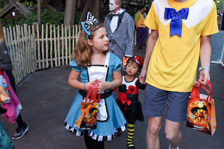 We made our way over to ride Pirates of the Caribbean, then we stopped to take a pictures of everybody's individual costumes. After that we headed over to ride Winnie the Pooh and when we got off the ride the Halloween party had officially started and we made our way through the first trick-or-treat station. Disneyland's Halloween party was much more crowded than the one I attended at Disney World. But it still has the really fun Halloween feeling and it is so fun to walk around and see everybody's absolutely clever costumes.